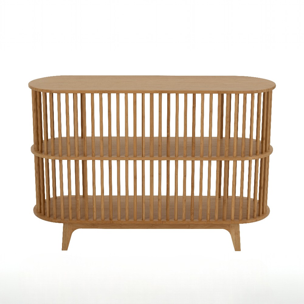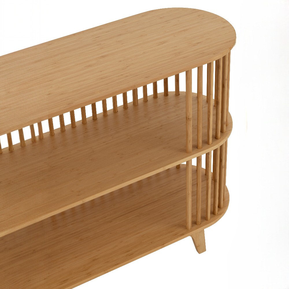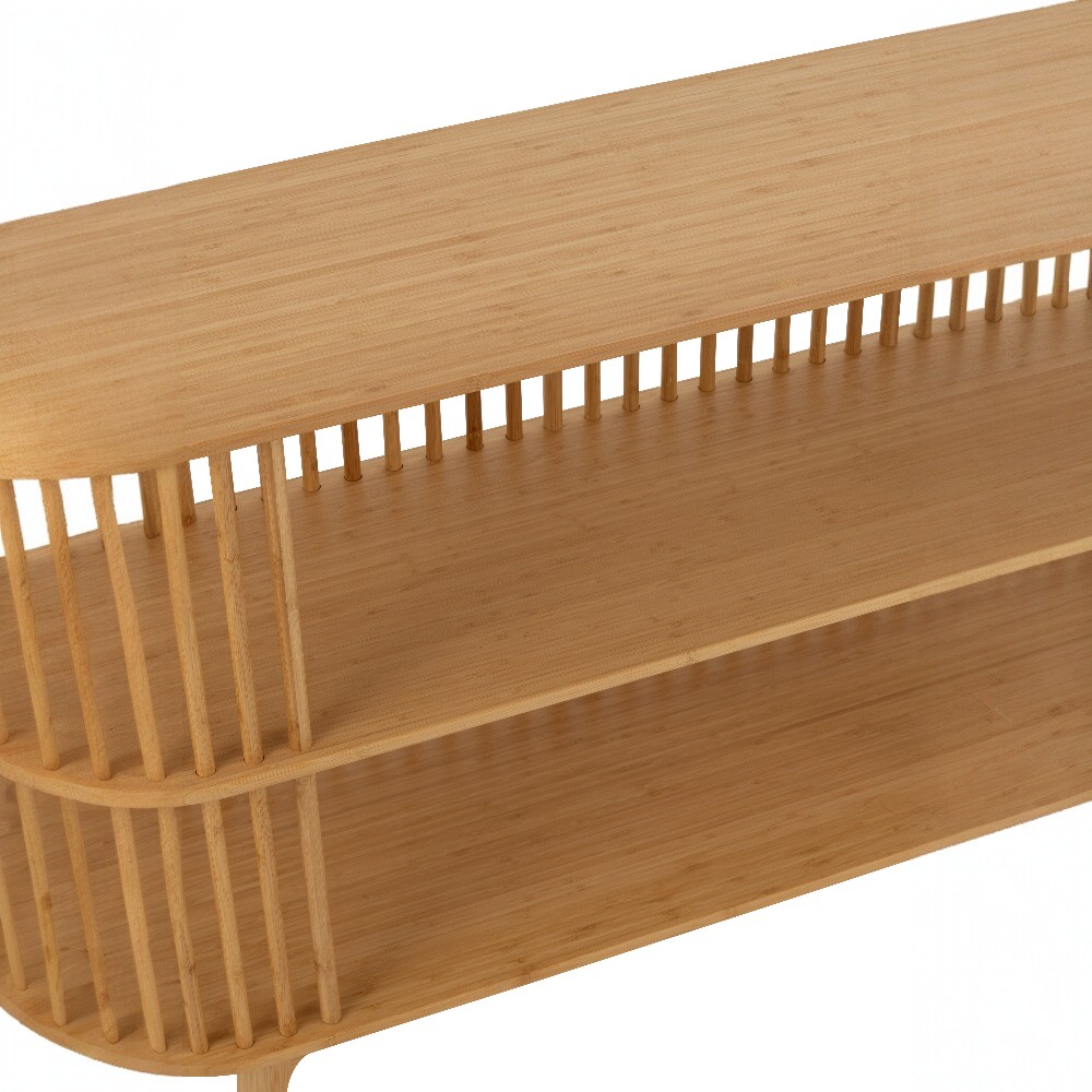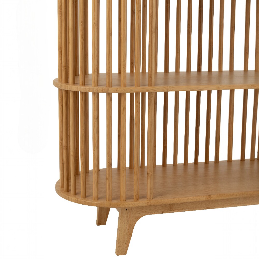 Ez a bambusz, rattan és nád felhasználásával készült komód természetes anyaghasználatával és finoman ritmizált szerkezetével könnyed, mégis karakteres jelenlétet ad a térnek. A függőleges pálcákból álló oldalsó és elülső kialakítás légies hatást kelt, miközben vizuálisan strukturálja a bútort, a meleg tónusú bambusz felület pedig nyugalmat és természetközeli hangulatot sugároz.