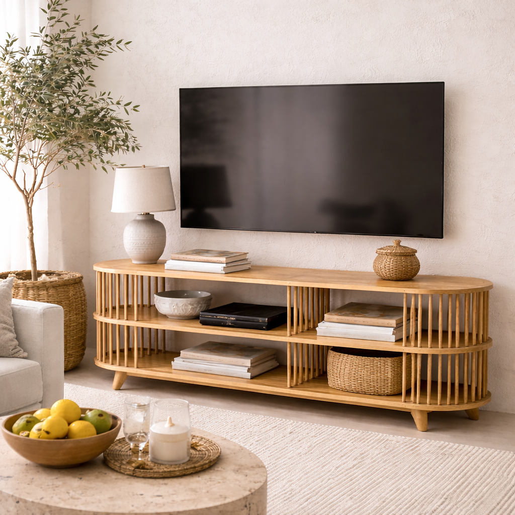 Ez a TV-állvány tökéletes választás mediterrán, bohém, japandi vagy természetes enteriőrökbe, ahol az őszinte anyaghasználat és a visszafogott elegancia kiemelt szerepet kap, és ahol a funkció és az esztétikum finom egyensúlya valóban számít.