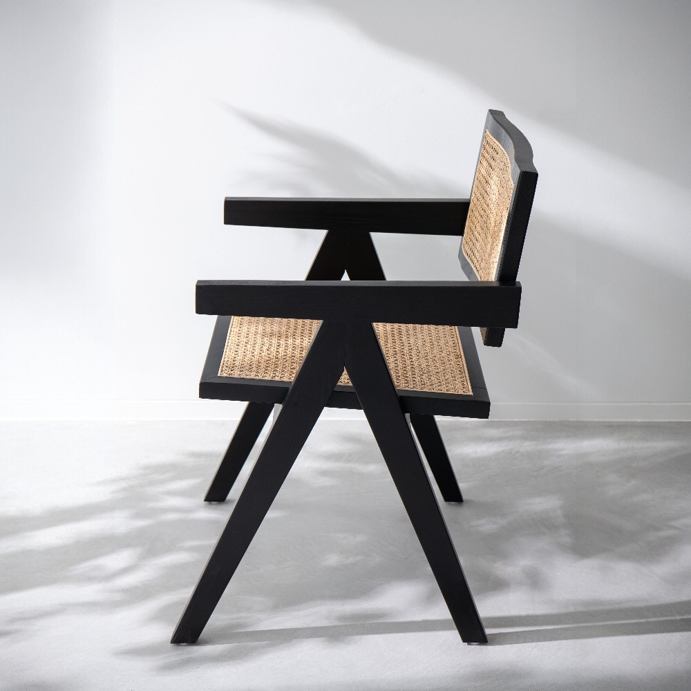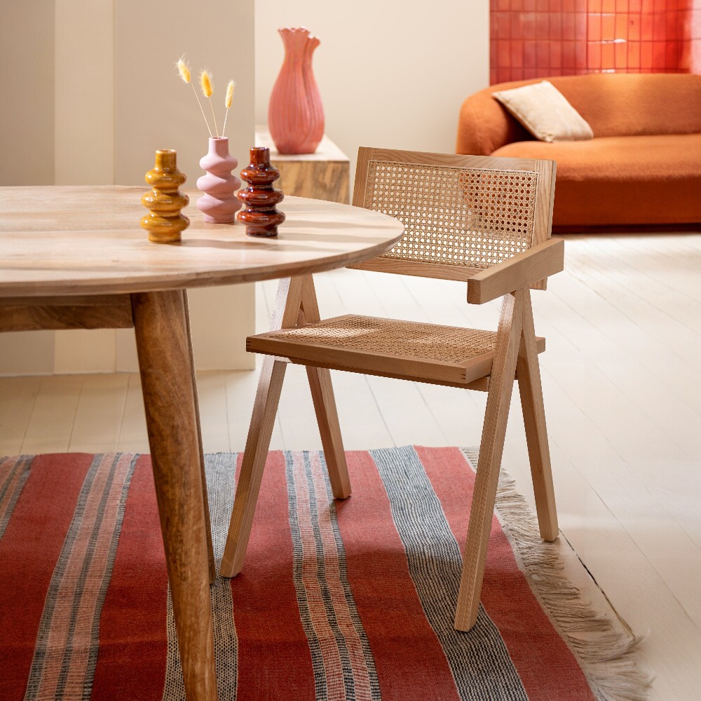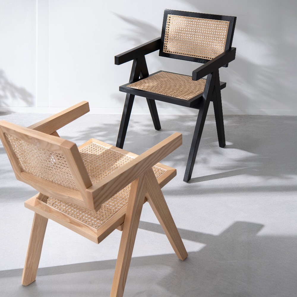 Ez a szék a természetes anyagok időtlen eleganciáját hozza el a mindennapokba. A tömör fa váza stabil, mégis könnyed karaktert ad a formának, míg a fonott rattan ülő- és háttámla levegős, finoman texturált felületével meleg, otthonos hangulatot teremt.
