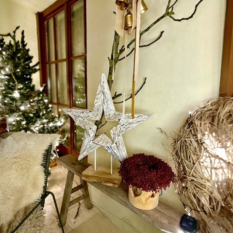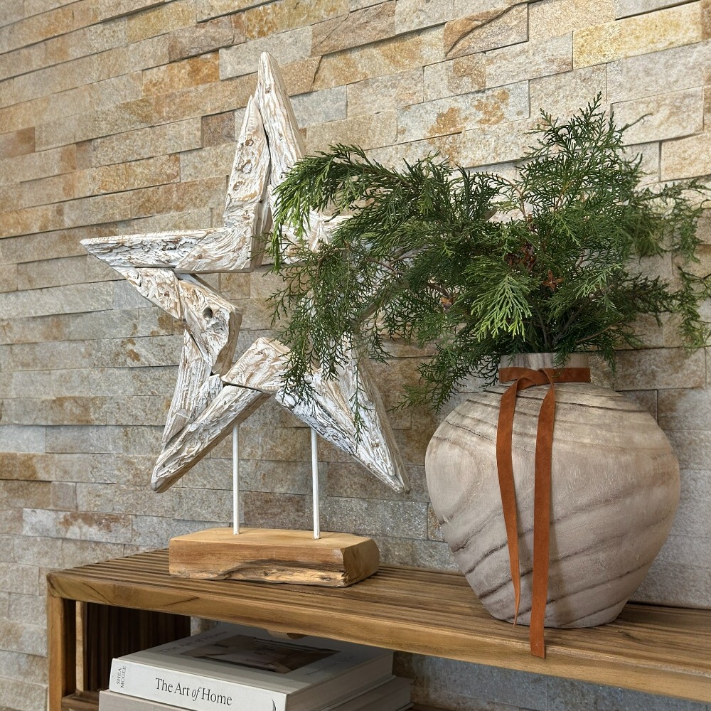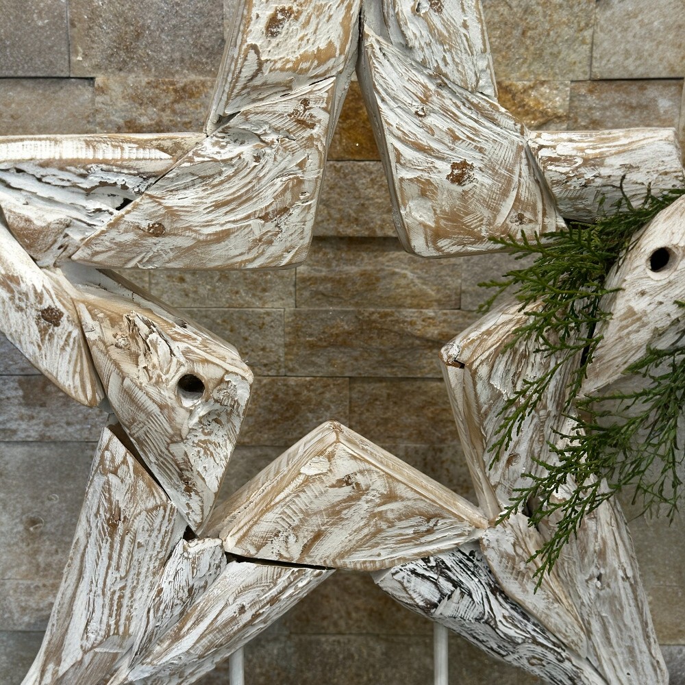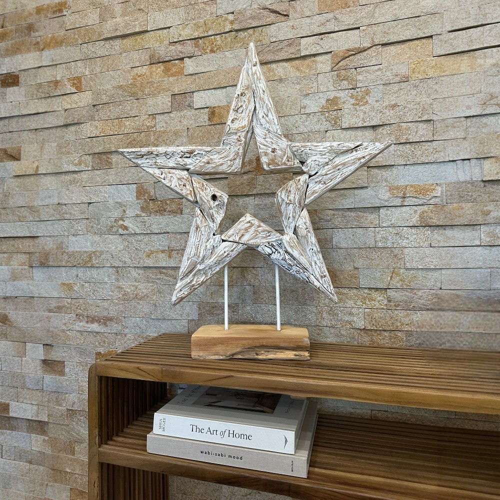 Ez a rusztikus, természetes megjelenésű uszadékfa csillag tökéletes választás karácsonyi dekorációként. A természetes és fehérre pácolt fa anyag különleges patinát kölcsönöz ennek az álló csillagnak, amelynek szellős, kétszeres csillag kialakítása modern és elegáns hatást kelt. Az állványon található, stabil fából készült talp segít, hogy könnyedén elhelyezhető legyen polcokon, ablakpárkányon vagy akár a padlón. Bármely helyiség meghatározó díszítőeleme lehet, otthonos és ünnepi hangulatot teremtve.