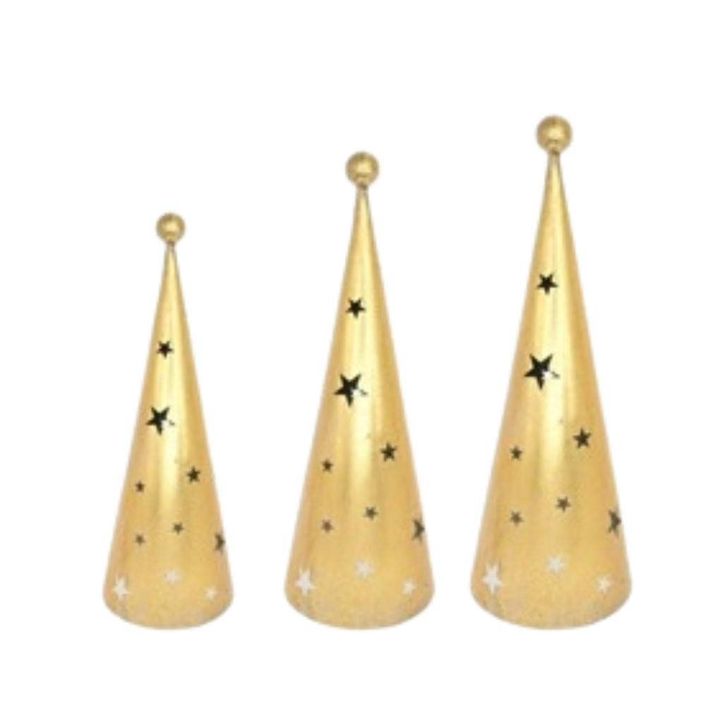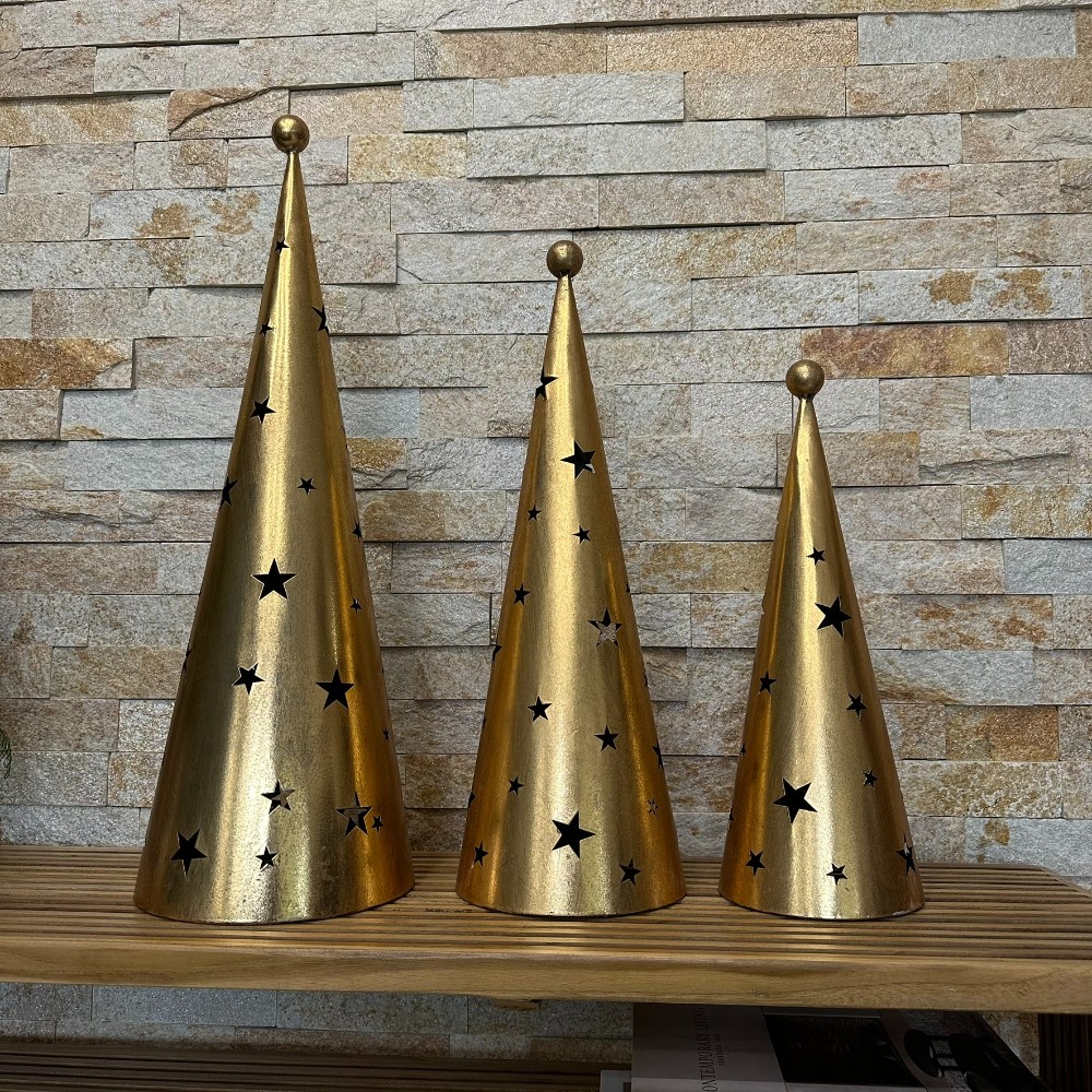 Arany színű, fém anyagból készült, 3 különböző magasságú karácsonyfa formájú dekoráció különleges hatást kelt a csillag formájú lyukakon kiszűrödő fényeivel.