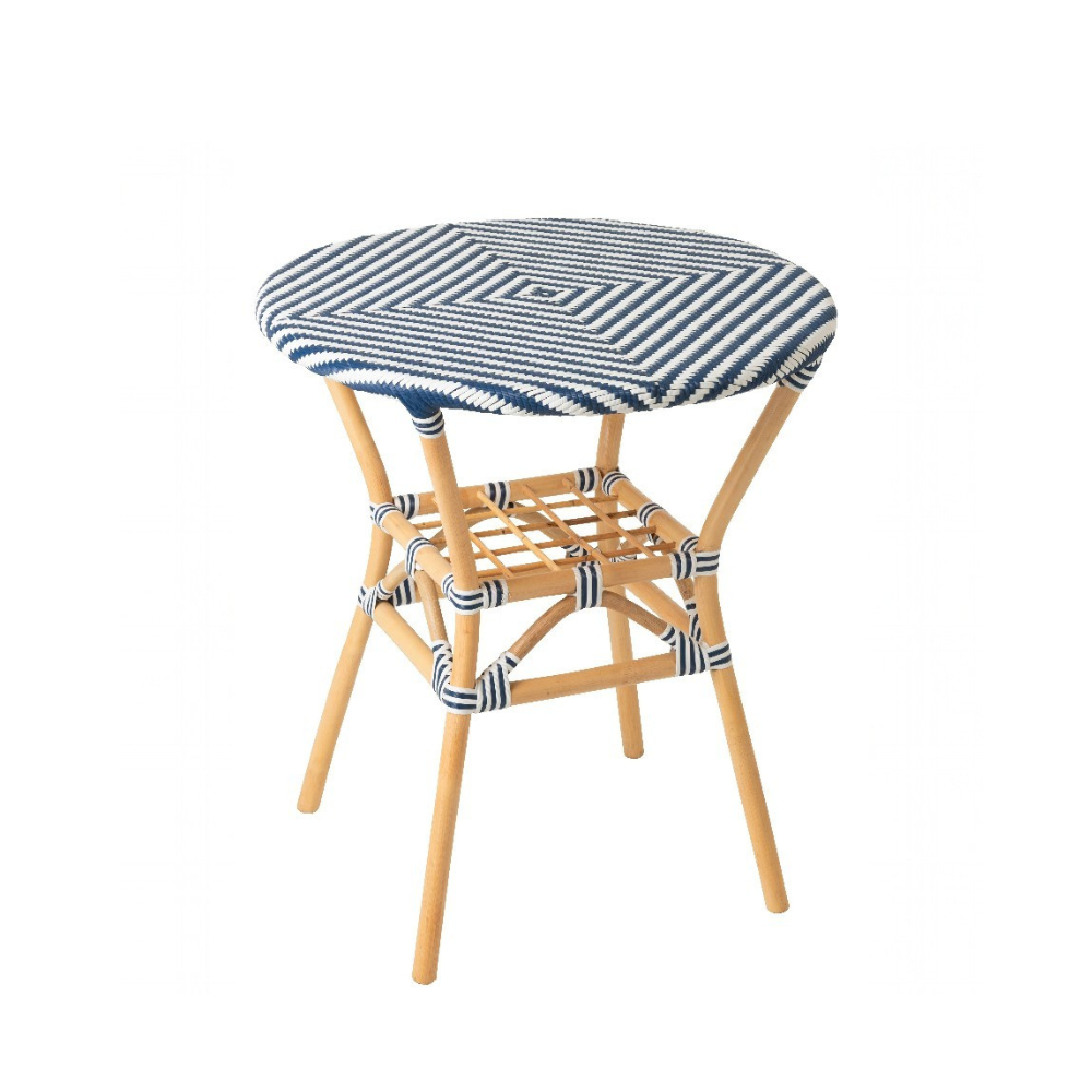 Ez a könnyed, mégis karakteres megjelenésű asztal a mediterrán életérzés és a francia kávézók időtlen hangulatát idézi meg. A természetes hatású fa váz finoman ívelt lábakkal és stabil szerkezettel biztosítja a tartósságot, miközben megőrzi a légies, elegáns megjelenést. A kézzel fonott, kék-fehér mintás felület különleges vizuális ritmust ad az asztallapnak, amely egyszerre friss, nyári és klasszikus hangulatot teremt.