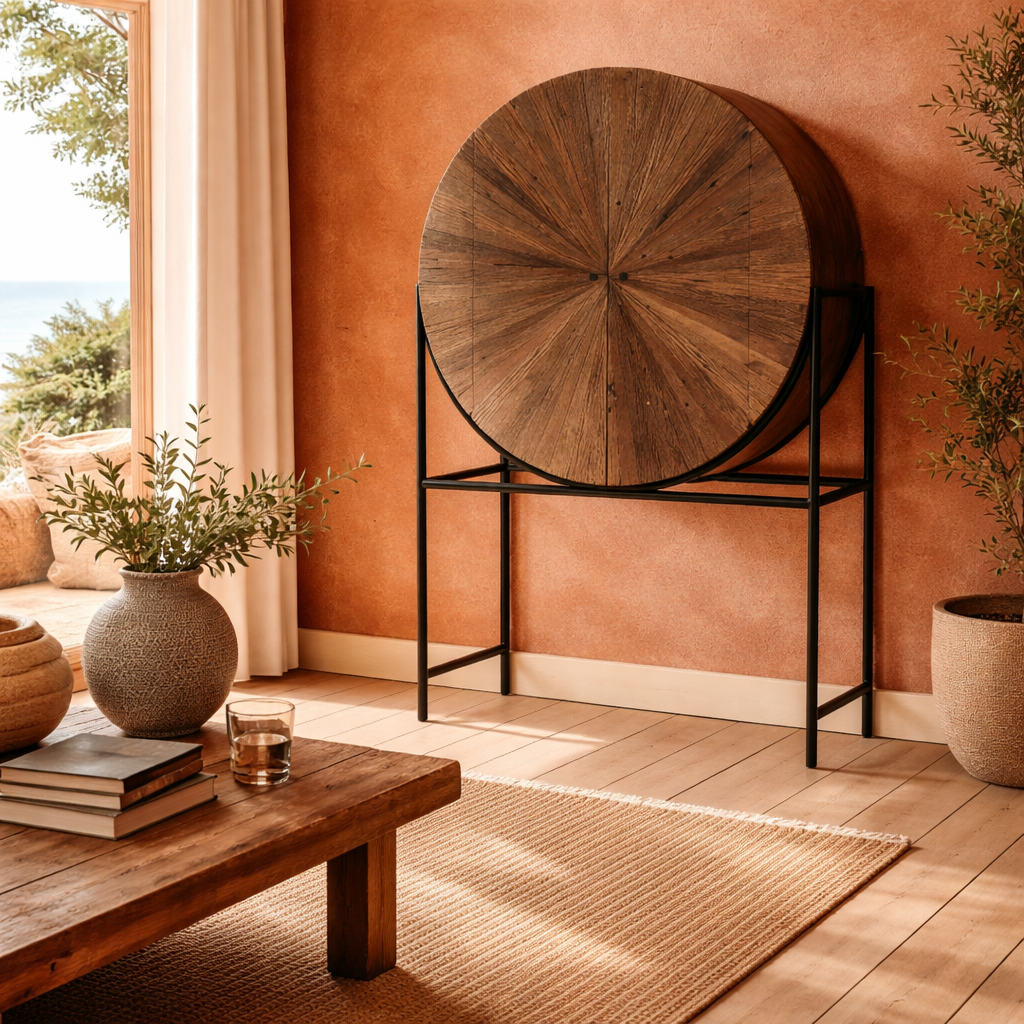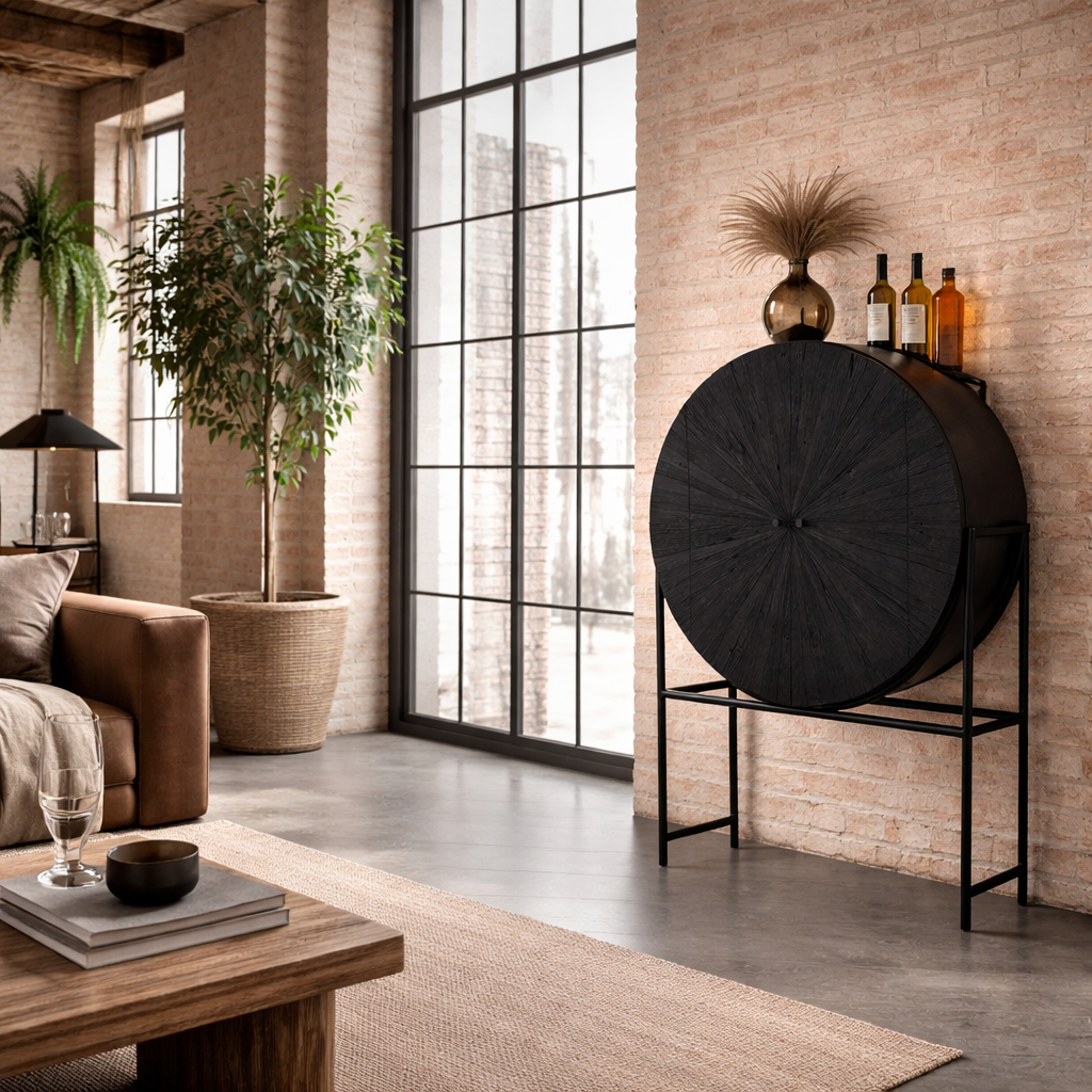 A markáns karakterű, újrahasznosított fából készült tárolóbútor egyszerre hordozza a természet időtlen szépségét és az ipari formavilág letisztult erejét. A kör alakú, vastag faajtó különleges, sugárirányú erezetével szinte egyedivé teszi minden egyes darabot: a repedések, csomók és finom egyenetlenségek nem hibák, hanem a fa múltjának lenyomatai, amelyek melegséget és autentikusságot visznek a térbe. A masszív, mégis légies hatású fém váz stabil tartást ad, miközben elegáns kontrasztot teremt a rusztikus fa felülettel.
