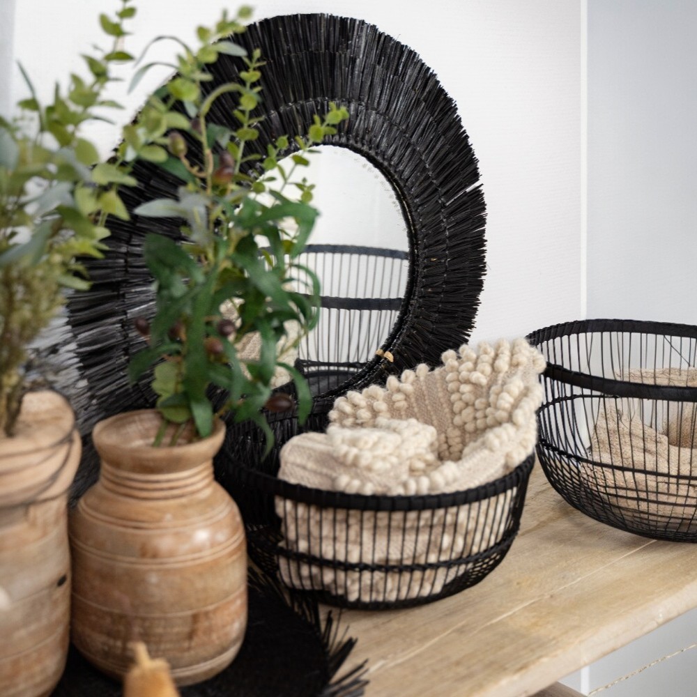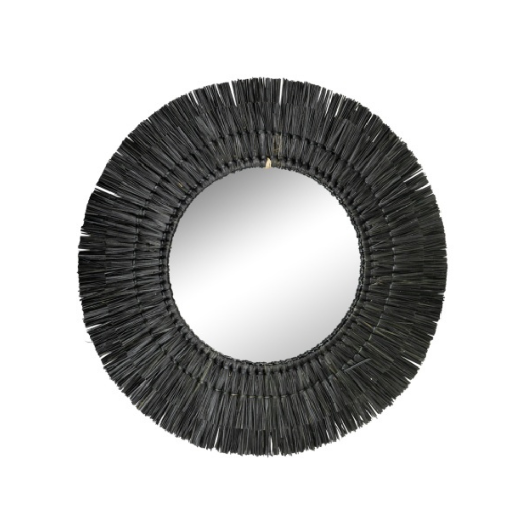 Ez a stílusos fekete tengerifű tükör tökéletes kiegészítője lehet bármely modern vagy természetközeli otthonnak. A kézzel készített keret természetes tengerifű anyagból készült, amelyet fekete színnel festettek, hogy elegáns és karakteres megjelenést biztosítson. A tükör egyedi, kör alakú kialakítása az egyszerűség és az exkluzivitás tökéletes harmóniáját testesíti meg. Ideális nappaliba, hálószobába vagy akár előszobába, hogy személyes és stílusos hangulatot teremtsen.
